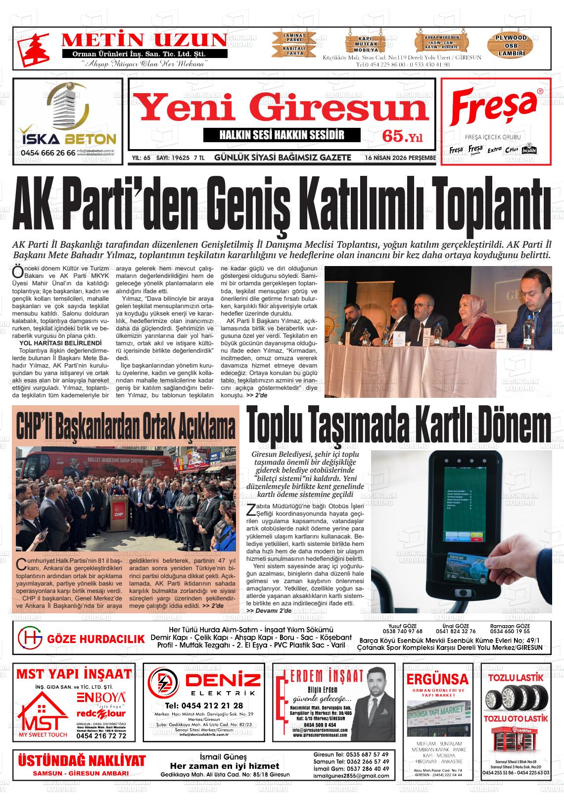 Gİresun Yerel Gazeteleri 16 Nisan 2026, Perşembe Günü Manşeti
